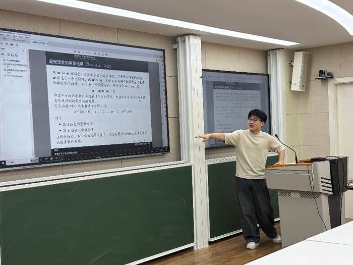 交流活动由武汉大学数学与统计学院2023级拔尖班周旸同学的报告开始。周旸的报告题目是“Implicit Bias in Deep Learning Methods”。报告介绍了深度学习中的两个典型特征,频率原则和聚集现象,并讨论了基于深度学习的微分方程求解方法,包括物理信息神经网络(PINNs)和深度最小作用量方法(DLAM),最后解释了损失函数中的微分算子如何重塑这些隐式偏差。