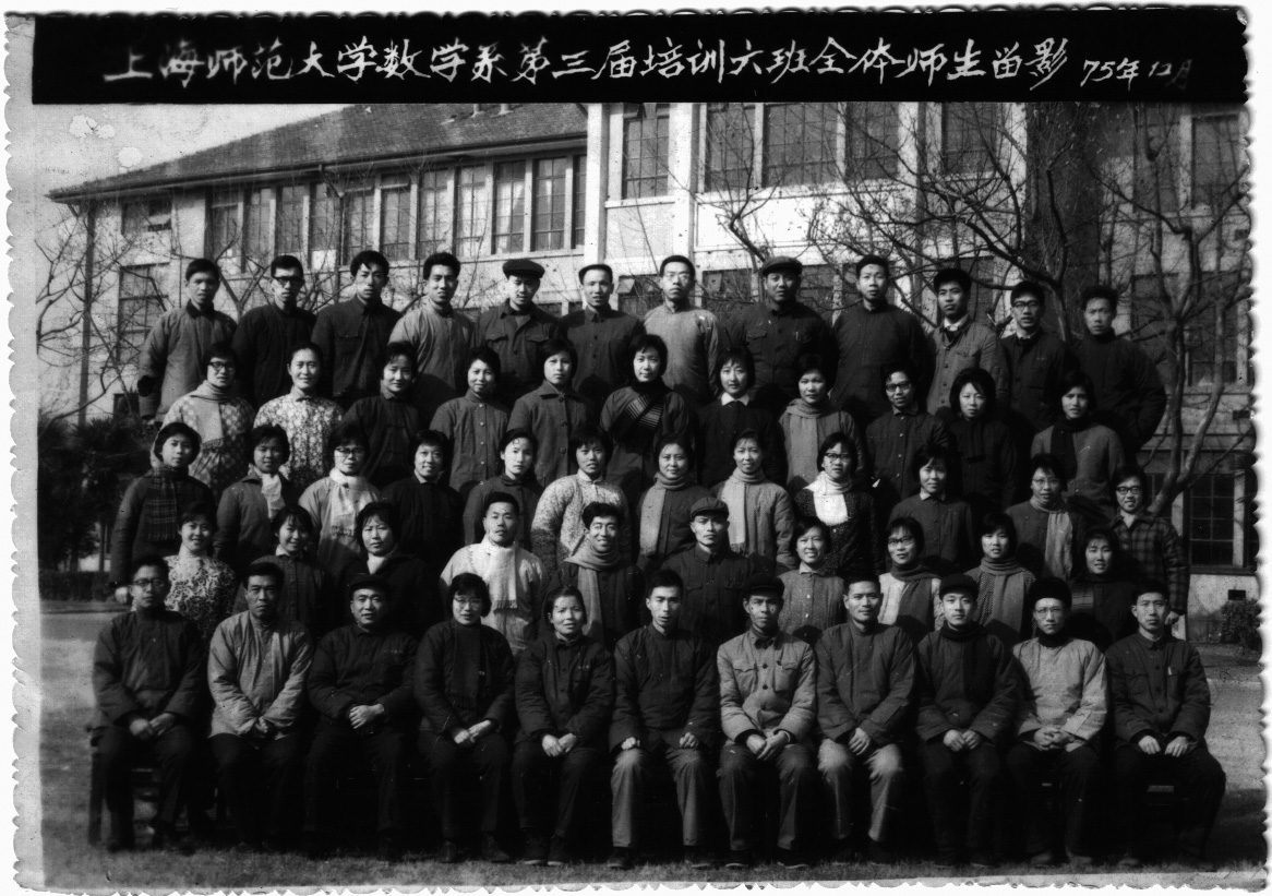 文革期间学校合并成上海师范大学,后来‘复课闹革命’了,系里招过几届学制一年左右的培训班。这张照片的学生大都是小学教师,基础较好。但所学课程也大都是初等数学复习及农村测量等。 照片第一排左起是:徐钧涛、丁老师(原上師大)、工宣队员、戴老师(原上師大)、陈秀英(工宣队数学系负责人)、丁师傅(工宣队数学系教工负责人)、周师傅(工宣队)、张永祺(原上師大)、 华煜烍、吳庭卓(原上师大)、?老师(原上师大)。(见上图,点击后可见更清晰大图,如能补出姓名的请与编者联系)