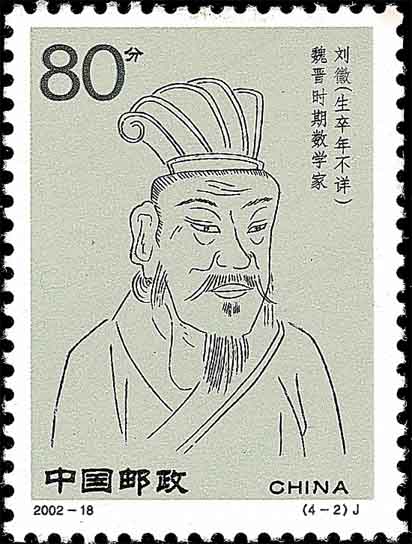 图3是东汉科学家张衡(78-139), 他在天文测量中得出圆周率π的两个近似值3.1466和3.1623, 这比印度和阿拉伯人早了500年. 图4是魏晋时期数学家刘徽(公元3世纪, 山东人, 图5是山东邮政刻制的首日纪念邮戳). 他在《九章算术·圆田术》注中, 用割圆术得出圆面积与周长的关系式和圆周率的计算方法(参见图6中上部和图7, 它们分别是中国邮资明信片和密克罗尼西亚邮票). 由此得到π=3927/1250=3.1416, 通称它为“徽率”. 请注意刘徽在割圆术中提出的“割之弥细, 所失弥少, 割之又割以至于不可割, 则与圆合体而无所失矣”, 这种计算思想就是当今的极限概念. 图8是南北朝时期数学家祖冲之(429-500, 中国小型张), 他则更计算出圆周率π在3.1415926和3.1415927之间, 并给出π的两个分数近似值: 约率22/7和密率355/113. 这些都比欧洲人早了一千年.