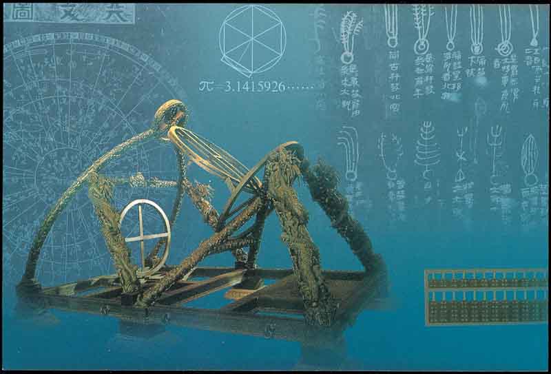 我国科学家对圆和圆周率的应用与研究有着悠久的历史. 图1是在甘肃出土的马家窑彩陶 — 四系罐, 它是五千年前(新石器时代晚期)制作的器皿, 罐体是旋转体, 罐上的纹饰有: 圆, 而且是同心圆; 四周绘制具有周期的波浪线. 说明了我国劳动人民对圆早就有了深刻的认识, 并能应用于生活和装饰. 图2是记里鼓车, 它发明于汉代. 车中装有传动齿轮和凸轮杠杆等机械, 车行一里, 车上木人击鼓一下. 只要倾听鼓声, 就知道车已行了多少路程. 这说明当时已能计算圆周长, 并据此设计车轮大小.