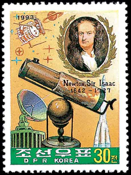 英国科学家牛顿(Isaac Newton,1642-1727,图6为1993年朝鲜发行的纪念牛顿的邮票)正是凭着渊博的数学知识,发现了万有引力定律。 并为科学的天文学奠定了基础。他解释了潮汐的现象,指出潮汐的大小不但同朔望月有关,而且与太阳的引力有关;牛顿还从理论上推测出地球不是球体, 而是两极稍扁、赤道略鼓,并由此说明了岁差现象。牛顿的许多发现都收在他的不朽杰作《自然哲学的数学原理》一书中。该书于1687年问世。 从此,一个崭新的天文学分支 — 天体力学便诞生了。