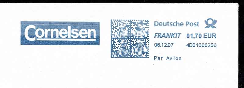 科学在进步,如今在条形码的基础上,又出现了二维码,它可以在很小的方块上存储更多的数据信息。二维码在欧美一些国家已经广泛应用于各项邮政业务, 如电子邮票(图7,美国,2004)、 电子邮资标签(图8,德国,2007)等等。2007年以来,中国邮政二维码的应用已在不同品牌的邮资机上进行试验(图9,中国试机邮戳,2007)。