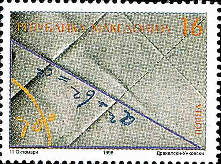 若以 a 和 b 分别表示两直角边的长, c 表示斜边的长, 则定理的结论是: a2+b2=c2 (图 2 是 1998 年前南斯拉夫马其顿共和国发行的邮票).