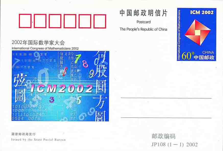 在这里应该特别指出, 中国古代对勾股定理的发现也是非常早的. 在《周髀算经》(公元前 100 年) 中讲述商高与周公对话中就提到勾 3 股 4 弦 5. 这段对话是在公元前 1100 年左右的西周时期. 随后在《九章算术》(约在公元 50 至 100 年间) 一书中就有勾股定理的一般性叙述. 我国最早对勾股定理的证明是三国时期的吴国数学家赵爽 (公元 3 世纪). 赵爽创制了一幅``弦图'', 用形数结合的方法, 给出勾股定理证明. 图 9 是 2002 年中国发行的邮资明信片, 其中的邮资图便是赵爽弦图, 左边图中的〈勾股圆方图〉是《周髀算经》中的一部分, 赵爽就是在〈勾股圆方图〉的注释里给出勾股定理证明. 这在现行中学数学教材里都有介绍.