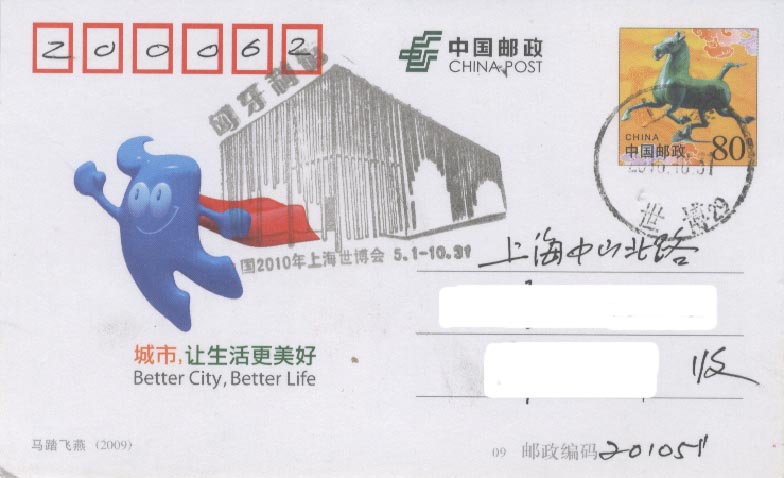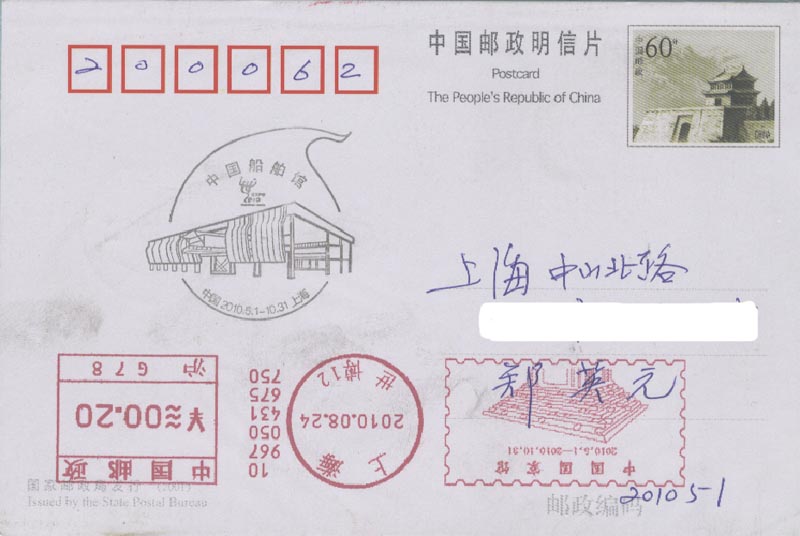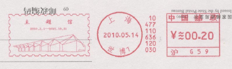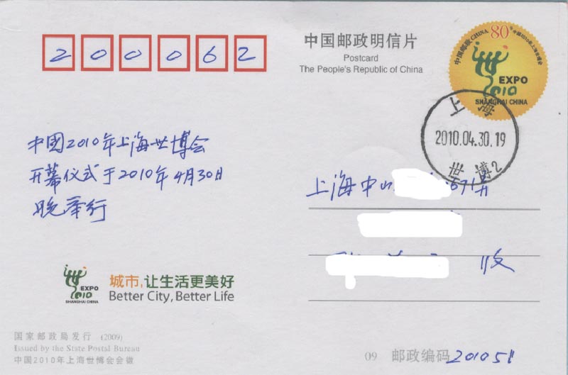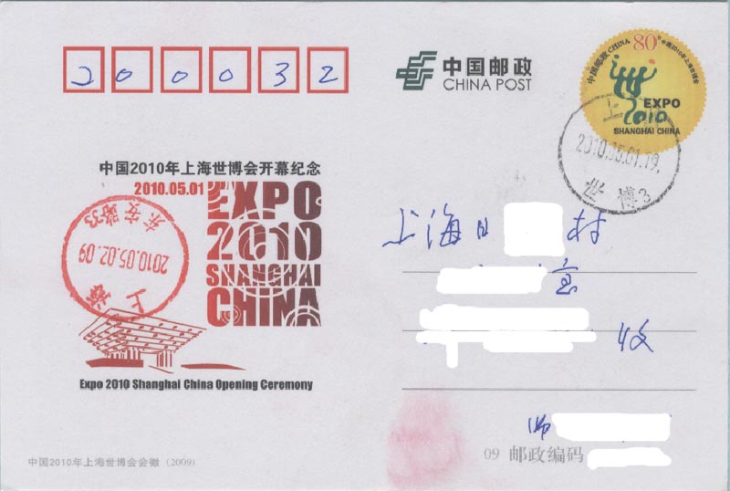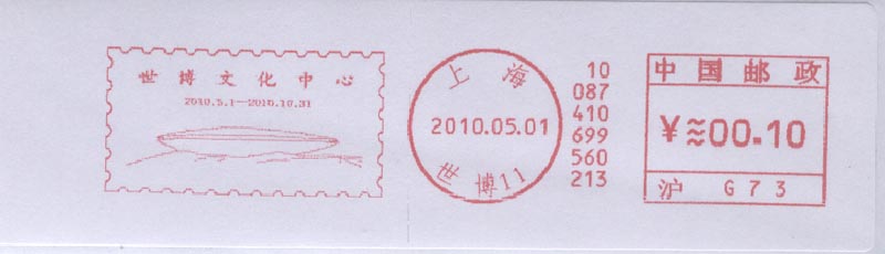 中国2010上海世界博览会于2010年4月30日晚上举行盛大的开幕仪式(图22),5月1日早上正式开园(图23)。为此, 中国邮政发行一枚纪念邮票和各种纪念邮戳(图24)