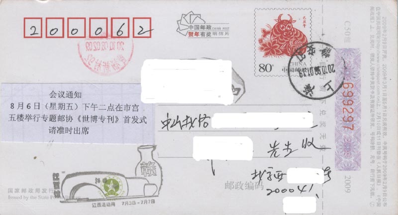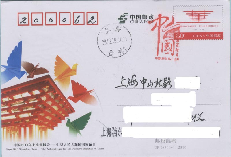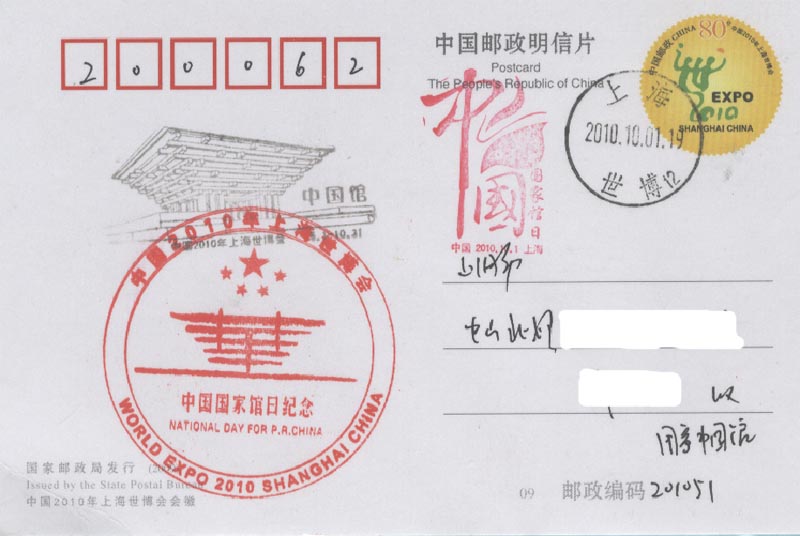 图30-1(实寄的中国国家馆日纪念邮资明信片)