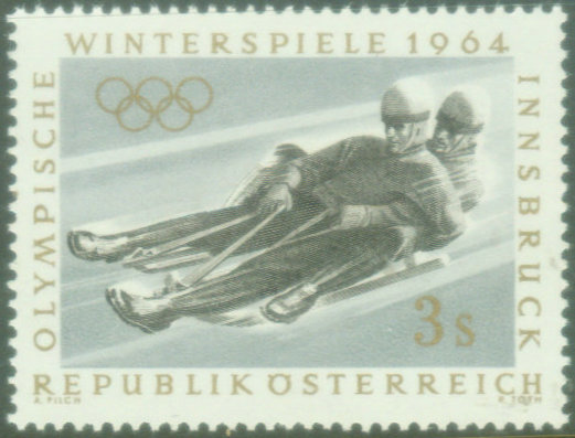 第九届冬奥会于1964年在奥地利因斯布鲁克举行。因斯布鲁克地处阿尔卑斯山下,海拔570米。这次奥林匹克圣火与夏季奥运会一样,取自古奥运会发源地希腊的奥林匹亚。 图9是奥地利为这届冬奥会特制的纪念信封,贴冬奥会纪念邮票,票图为冬季两项,盖这届冬奥会会徽的邮戳。她是这届冬奥会开幕日(1964年1月29日),从比赛场地蒂罗尔州的塞费尔德寄往德国不莱梅。