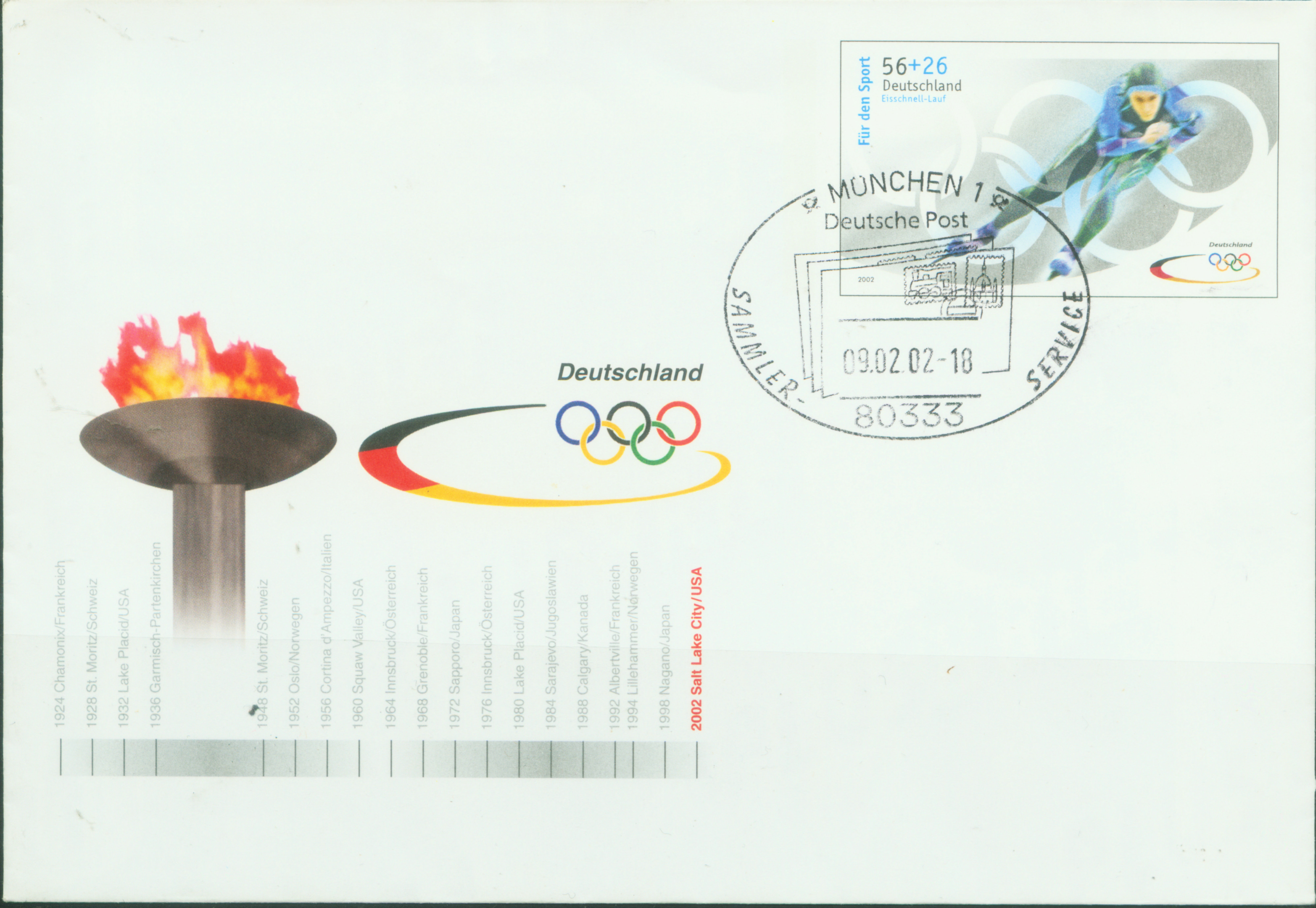 前面已经说过,第19届冬奥会2002年在美国犹他州盐湖城举办。图11是德国为这届冬奥会发行纪念信封,信封的正反面印有滑雪跳台和法国、美国、德国、加拿大为这届发行的纪念邮票。 这届冬奥会重大新闻是盐湖城奥申委贿赂国际奥委会官员的丑闻,一时引起轩然大波。这一事件导致多名国际奥委会官员宣布辞职或被解职。 图11是由德国巴登·符腾堡州的洛尔希2002年1月31日寄往北莱茵·威斯特法伦州的诺伊基兴。
